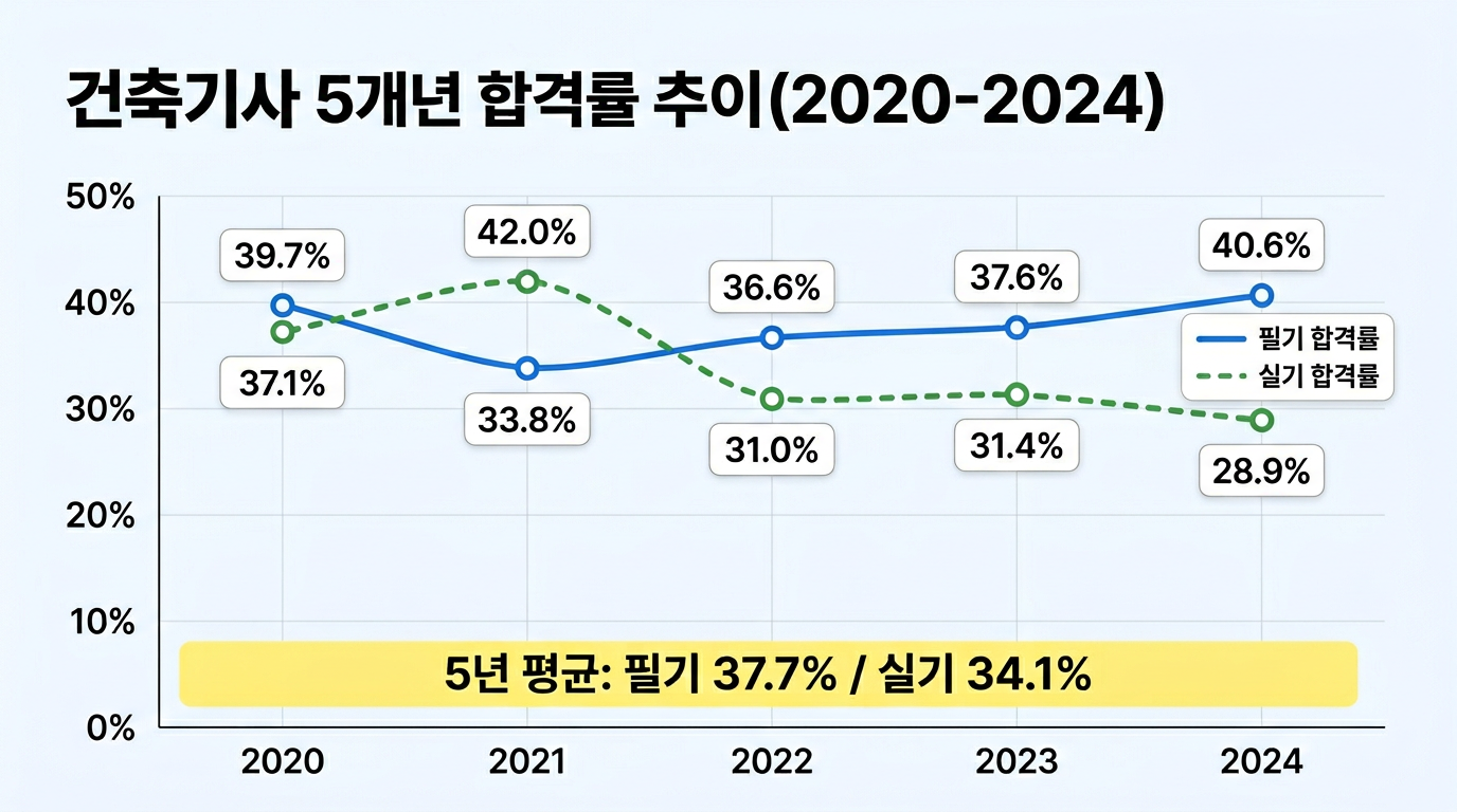 건축기사 필기시험은 5과목 100문항을 150분 안에 풀어야 합니다. 과목당 40점 미만이면 바로 과락, 전 과목 평균 60점 이상이어야 합격입니다. 2024년 필기 합격률은 40.6 %(응시 21,802명, 합격 8,841명)로 10명 중 6명은 떨어지는 시험이죠. 이 글에서는 10개년 기출 데이터를 바탕으로 과목별 출제비중, 빈출 키워드, 과락 위험도, 최적 공부순서를 전문가 시각으로 분석합니다.