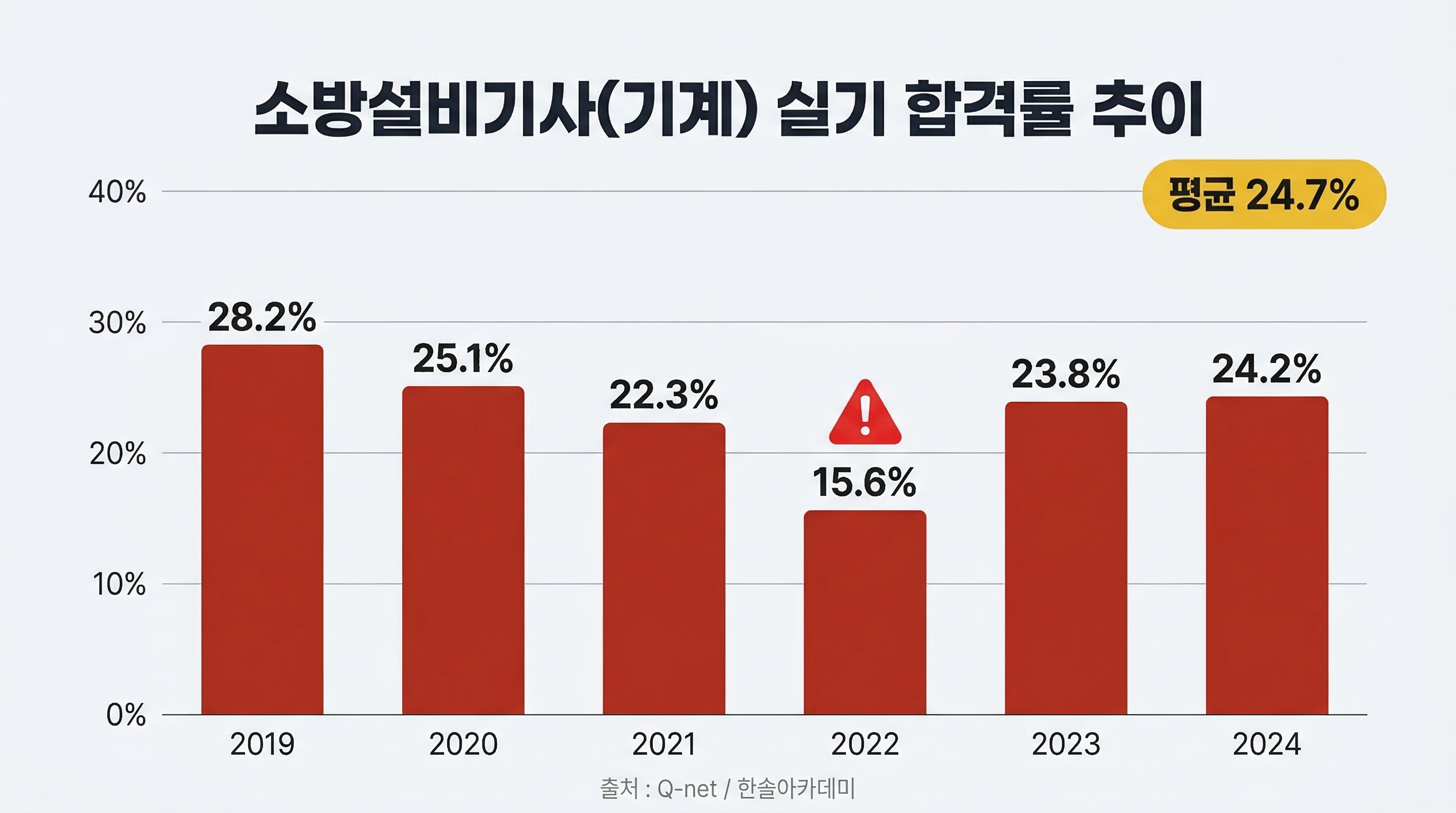 소방설비기사(기계) 실기 합격률은 필기(약 46%)에 비해 절반 이하로 매우 낮습니다. 연도별 변동 폭도 크며, 이는 출제 난이도가 회차마다 크게 달라지기 때문입니다.