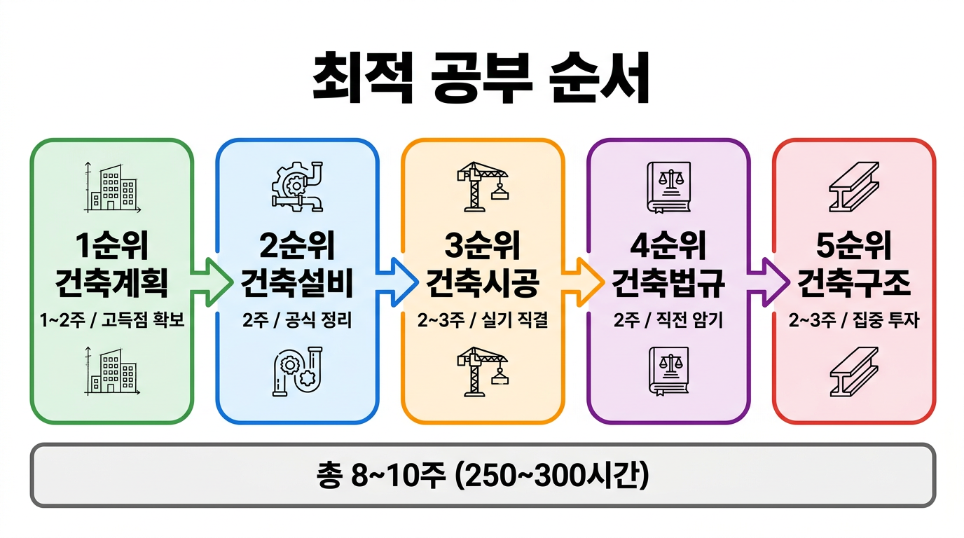 | 3순위 | 건축시공 | 2~3주 | 분량 최대, 실기 직결 → 여유 있게 시작 |