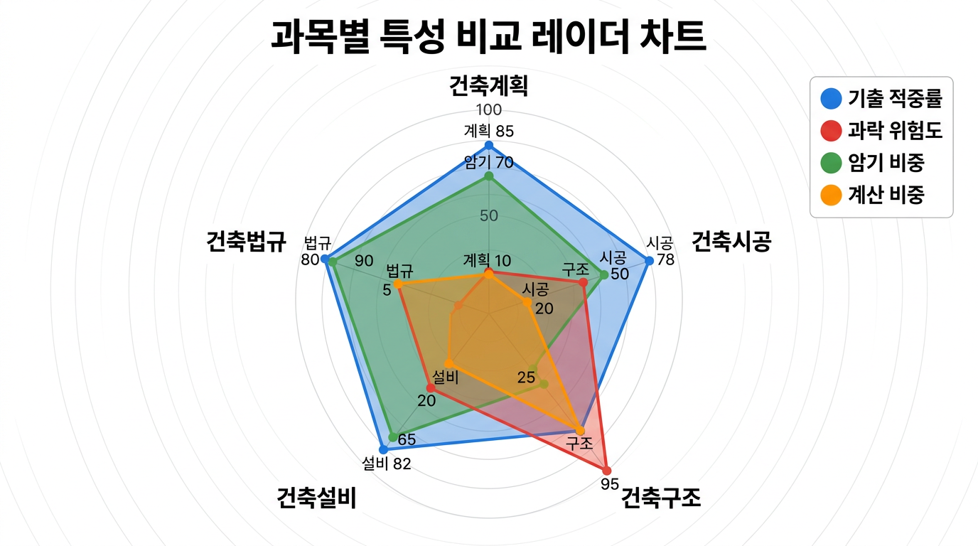 건축구조입니다. 구조역학 계산 문제와 철근콘크리트 공식이 많아 비전공자·문과 출신 수험생이 특히 어려워합니다. 전체 학습 시간의 30 %를 건축구조에 투자하세요.