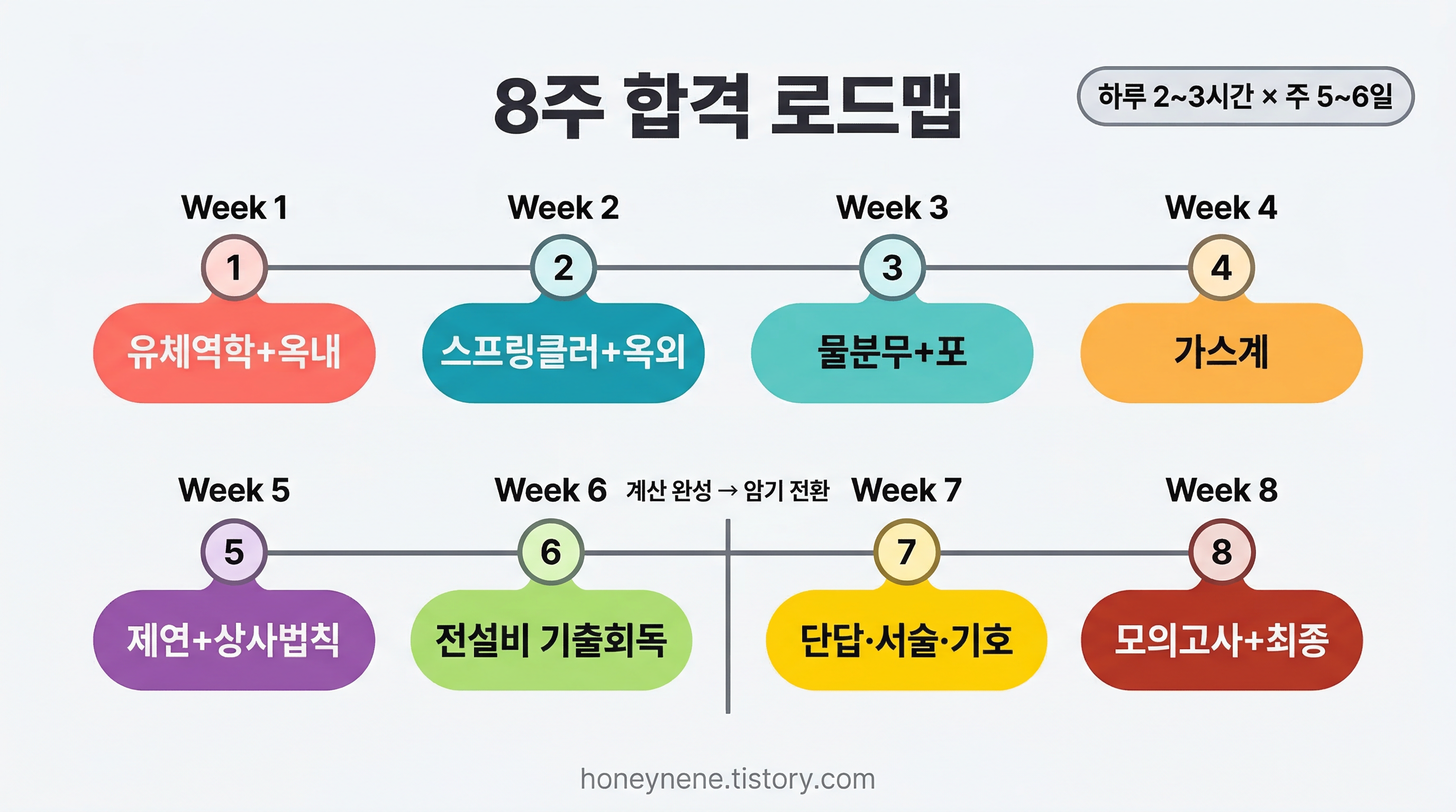 | 8주차 | 실전 모의고사 + 최종 점검 | 기출 3회분 실전 모의고사(시간 재기, 3시간) → 계산 공식 10개 최종 점검 → 단답 키워드 최종 암기 → 계산기 조작 확인 | 모의고사 60% + 최종 암기 40% |
