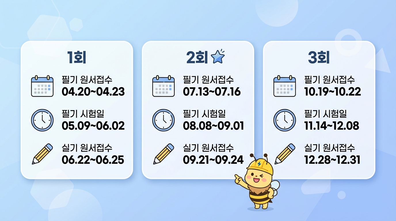 2026 전기기사 시험은 연 3회 시행되며, 2회 필기 원서접수는 4월 20일부터 시작됩니다. 지금(2월)부터 준비하면 약 2개월의 학습 기간을 확보할 수 있어요.