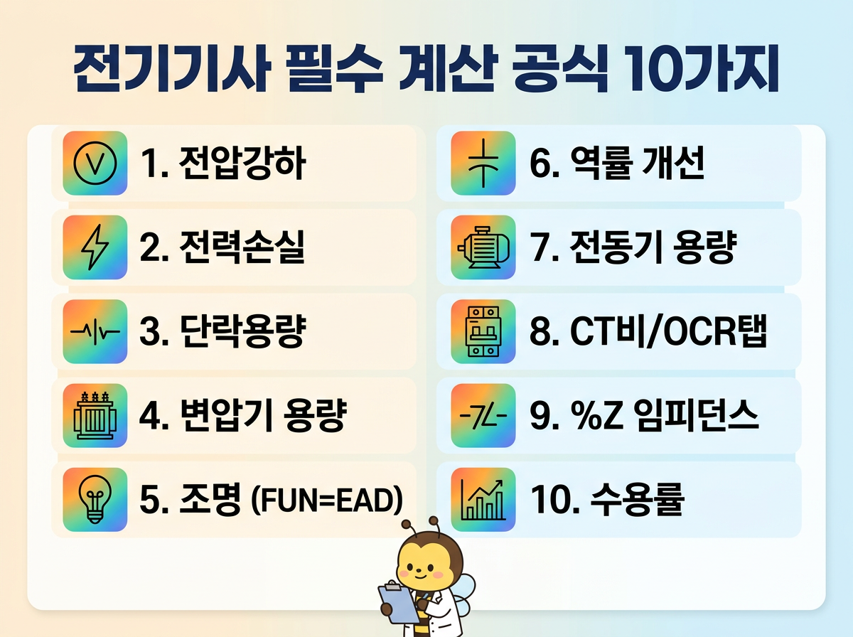 전압강하 공식 e = I(Rcosθ + Xsinθ), 전력손실 공식 Pl = 3I²R, 차단용량 공식 Is = P/(√3 × V), 조명 공식 FUN = EAD가 초빈출입니다. 이 4개만 확실히 외워도 계산 문제의 절반 이상에 대응할 수 있습니다.